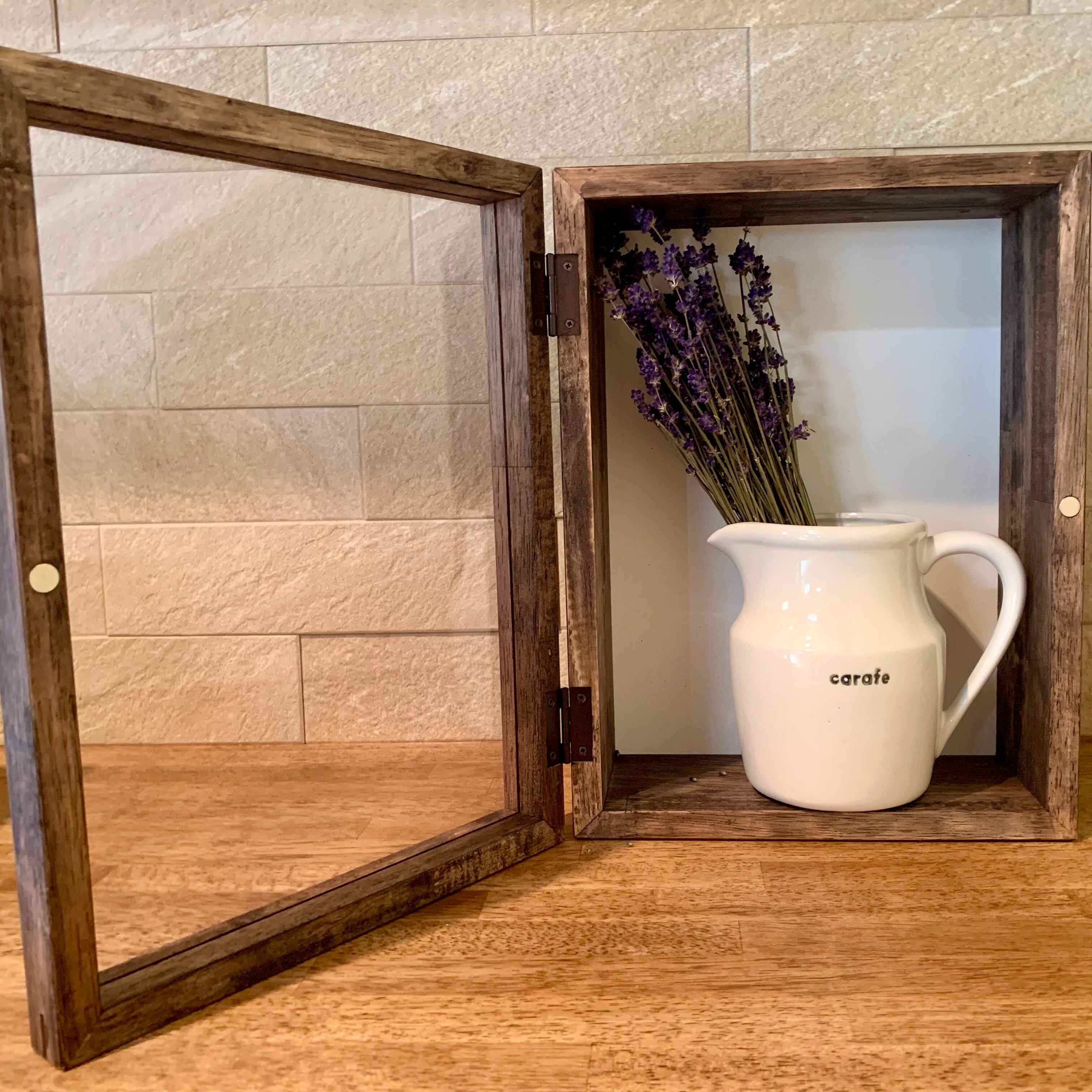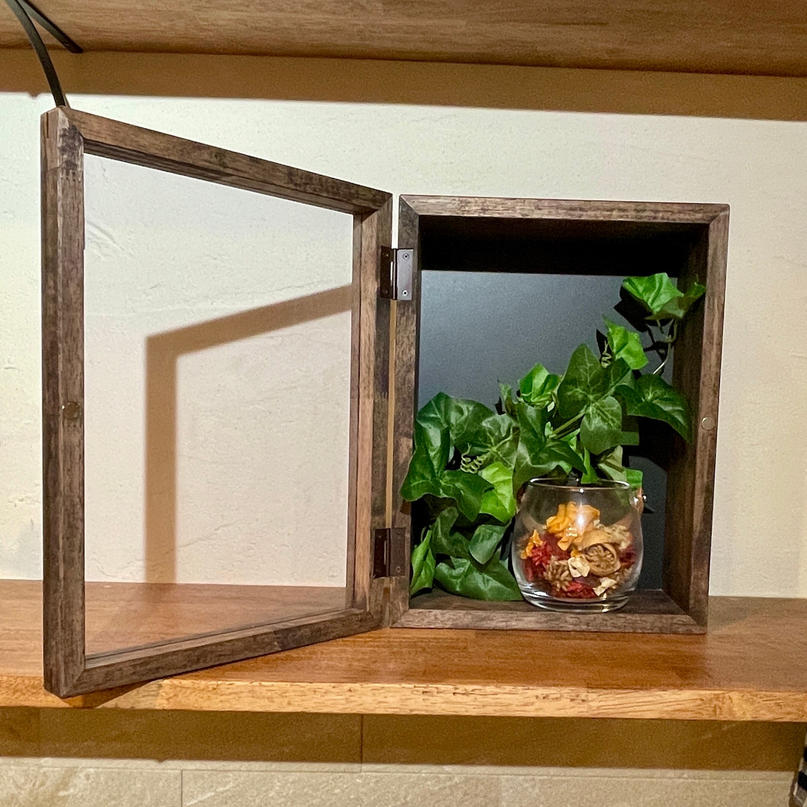 正面の部分は丁番付きの扉になっているのでホコリも入りにくく、中の物を簡単に出し入れすることができます。取手はなくスッキリとしたデザインで、埋め込んだ磁石の磁力で開閉をしています。扉の透明な部分はアクリル板を使用しており、割れる心配がなく安心してお使い頂けると思います。