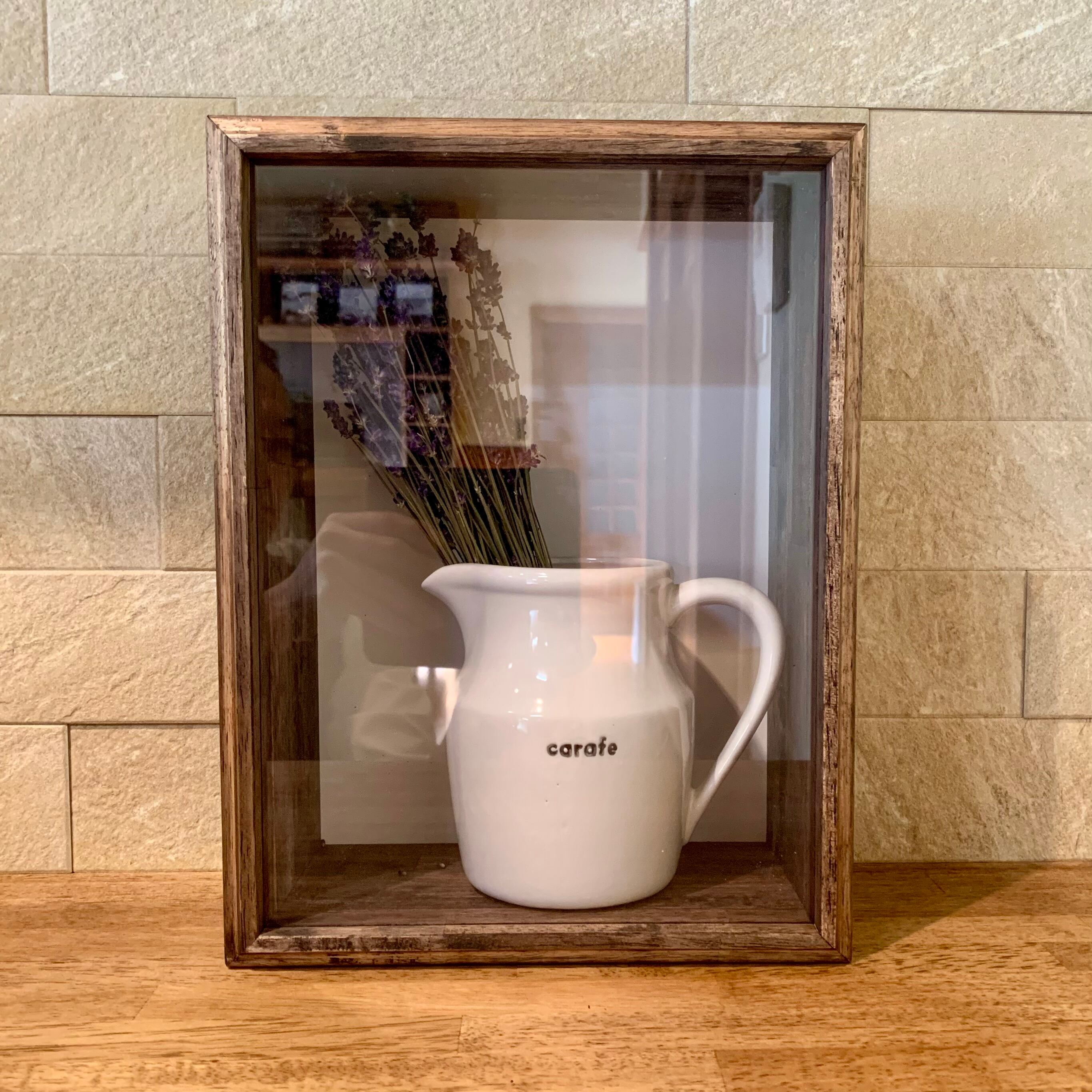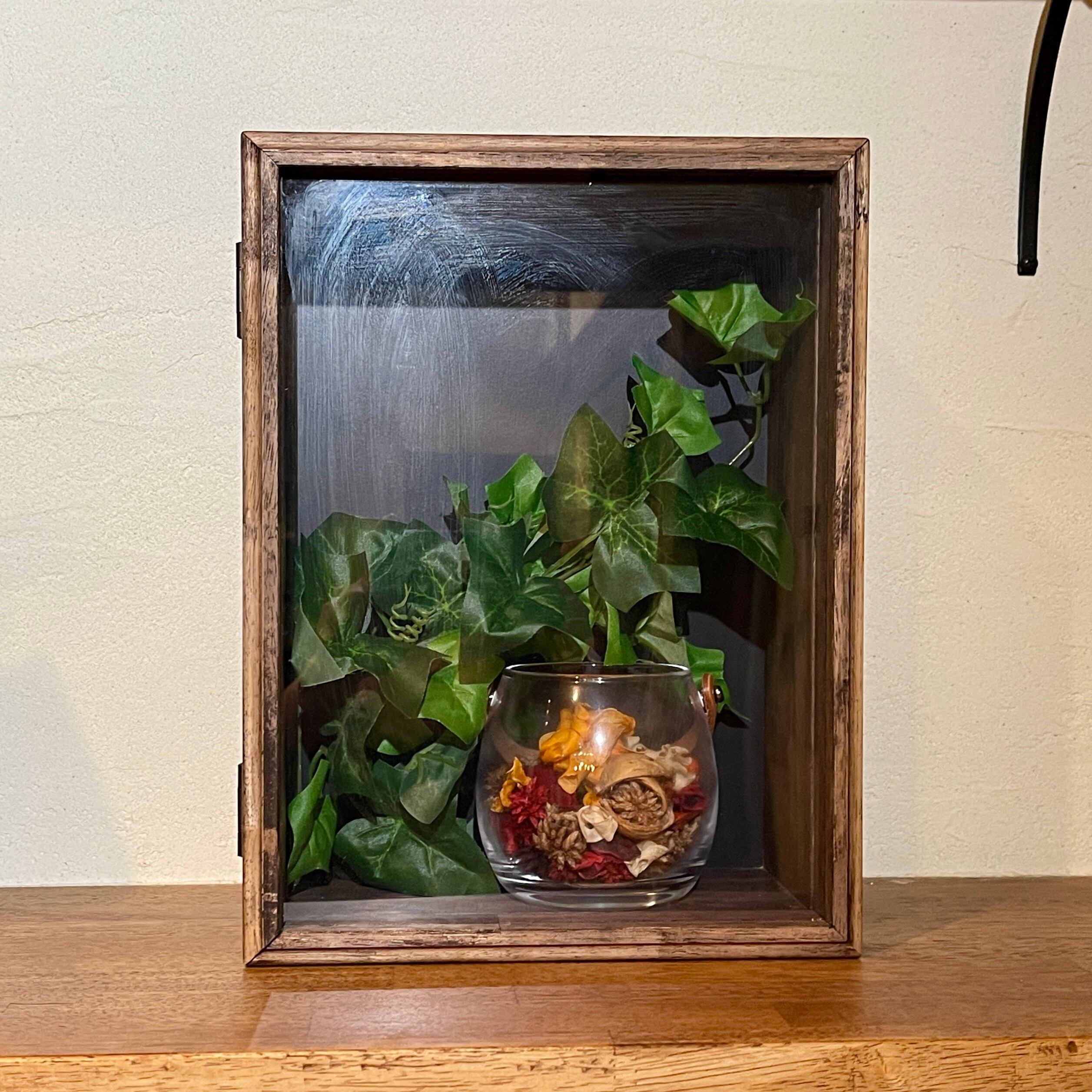 こちらの商品は、ゴムの寄木でつくったディスプレイボックスで、リビングなどの壁に取付けてお気に入りの雑貨を飾ったり、オリジナルにアレンジしたディスプレイをつくって楽しんだりと、使い方は色々。カウンターやチェストに置いてご使用することもできます。